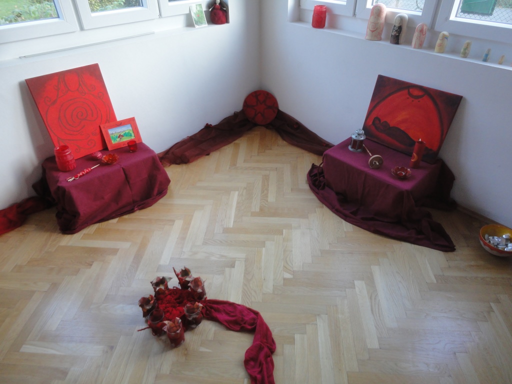 Das Aufbauen ist für mich schon zu einem Ritual geworden. Einen komplett leeren Raum in einen gemütlichen, warmen zu verwandeln, macht mir wirklich Freude. Zuerst hänge ich den großen Baldachin auf an einem eigens dafür befestigten Haken an der Decke, den ich dann mit Schnüren und Steinen wie ein Zelt abspanne, so dass ca. 7 Frauen gut Platz darin finden. Als nächstes kommt eine große rote Decke als Unterlage hinein, darauf Matten und Kissen. Die Mitte gestalte ich mit roten Kerzen und einem Frauenkreis aus Ton. Den restlichen Raum dekoriere ich mit den Kisten, in denen ich alles transportiere, auf die kommen rote Tücher und meine selbstgemalten Bilder und allerlei Dinge wie eine Matroschka, eine Handspindel und Postkarten. Für den Aufbau lasse ich mir insgesamt eine Stunde Zeit, damit ich es gemütlich machen kann und noch Zeit ist für Tee kochen, Schokolade und Nüsse in Schalen füllen und räuchern, die Kerzen in den vielen Windlichtern anzünden.