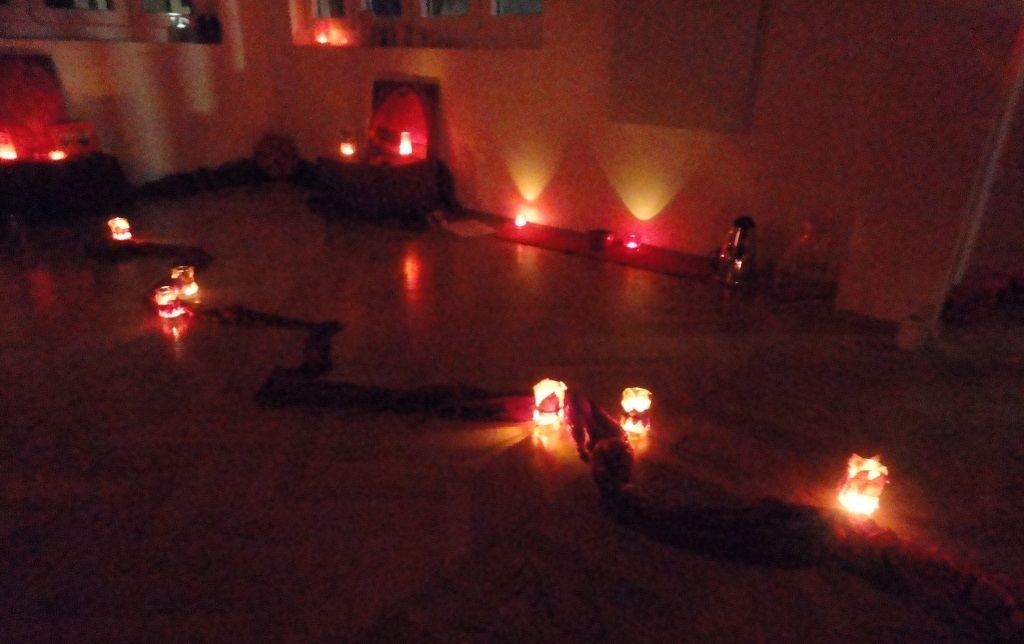 Nach und nach kommen die Frauen, gestern waren wir insgesamt 7 Frauen, darunter ein Baby-Mädchen, 6 Wochen alt. Ein paar von ihnen waren schon mal da gewesen, für einige war es eine neue Erfahrung. Zuerst kommen alle gemütlich an, machen es sich bequem, trinken Tee und lernen sich kennen. Am Sonntag legte ich aus roten Tüchern eine Schlangenlinie auf den Boden, die eine Lebenslinie repräsentierte. Wir sangen ein Lied, ich machte eine Achtsamkeitsübung und jede ging mit einer Kerze in der Hand die Linie entlang und stellte ihr Licht dort ab, wo sie ihren wohl schönsten Glücksmoment im Leben hatte. Im Roten Zelt tauschten wir uns dann darüber aus und machten gleich weiter mit vielen Dankesrunden, wofür jede in ihrem Leben dankbar ist. Da kam wirklich sehr viel zusammen, wunderschön zu sehen! Wir machten so viele Runden, bis uns erst mal nichts mehr einfiel 😉