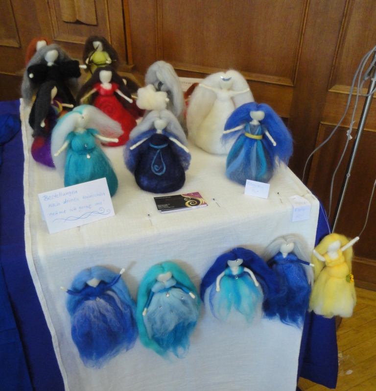 Ich stellte sie dann 2012 und die Jahre drauf auf der Göttinnen-Konferenz aus und bekam etliche Bestellungen, mittlerweile gab es auch einen Katalog und ich hatte das gesamte Jahres-Göttinnnen-Rad gefilzt oder je nach Thema der Konferenz (2014 Wasser-Konferenz in Wien). Auch bei uns in der Gegend nahm ich mal an einem Adventmarkt teil oder auf Märkten von „Spinnen und Weben“ in Wien! Das macht mir immer großen Spaß 😉