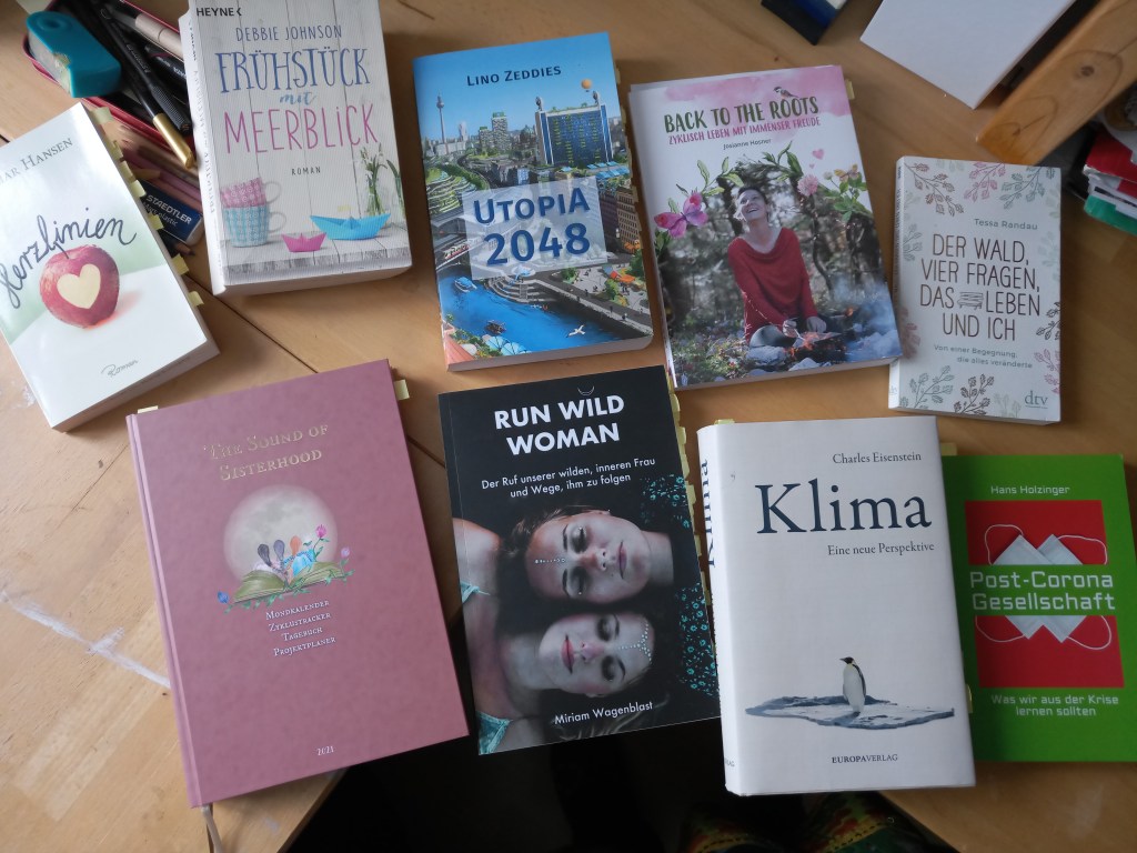 Am Ende des Jahres greife ich gerne intuitiv die Bücher aus dem Regal, die mich auf irgendeine Weise besonders inspiriert oder berührt haben – 2020 waren es die Romane von Dagmar Hansen, eines von Debbie Johnson (habe ich wie so manch anderes aus dem Büchertauschschrank vor der Uni), Utopia 2048 finde ich eine sehr spannende Vorstellung, wie es da so aussehen könnte mit Permakultur und bedingungslosem Grundeinkommen (das könnte ich gerade sehr gut gebrauchen, wieviel weniger Stress das wäre…), „Der Wald, vier Fragen, das Leben und ich“ von Tessa Randau ist echt eine nette Erinnerung an das, was wirklich wichtig ist im Leben. Mein neuestes und bisher tollstes Zyklusbuch ist das von Josianne Hosner von Quittenduft, es entspricht mir sehr und ist direkt aus dem zyklischen Leben gegriffen und endlich praxisnah ohne dass frau sich mies fühlen muss, weil sie sich in einer bestimmten Phase eben nicht so fühlt, wie es denn „sein sollte“ (für nicht-Schweizerinnen gibt es das Buch bei Stefanie Wagner). Run Wild Woman von Miriam Wagenblast ist eine feine Einstimmung und Erinnerung und wunderschönes Lesebuch, wenn dir mal nach Wildfrauenstimmung ist, den Titel wollte ich schon so manches mal direkt umsetzen und einfach nur weg hier 😉 Eine ganzheitliche Sicht auf das Thema Klima bietet Charles Eisenstein mit seiner Story of Interbeing, die mich immer wieder berührt. Und wer Ideen braucht für eine bessere Gesellschaft – wie wir sie „nach Corona“ (was immer das heißt..) aufbauen können (wir könnten auch genau jetzt damit anfangen… auf was warten???) kann ein paar davon bei Hans Holzinger finden (die Post-Corona-Gesellschaft). Mein neuer Zykluskalender ist von Carola von Sound of Sisterhood, er vereint Kalender, Zyklustracker und Projektplaner in einem, finde ihn bisher sehr praktisch!