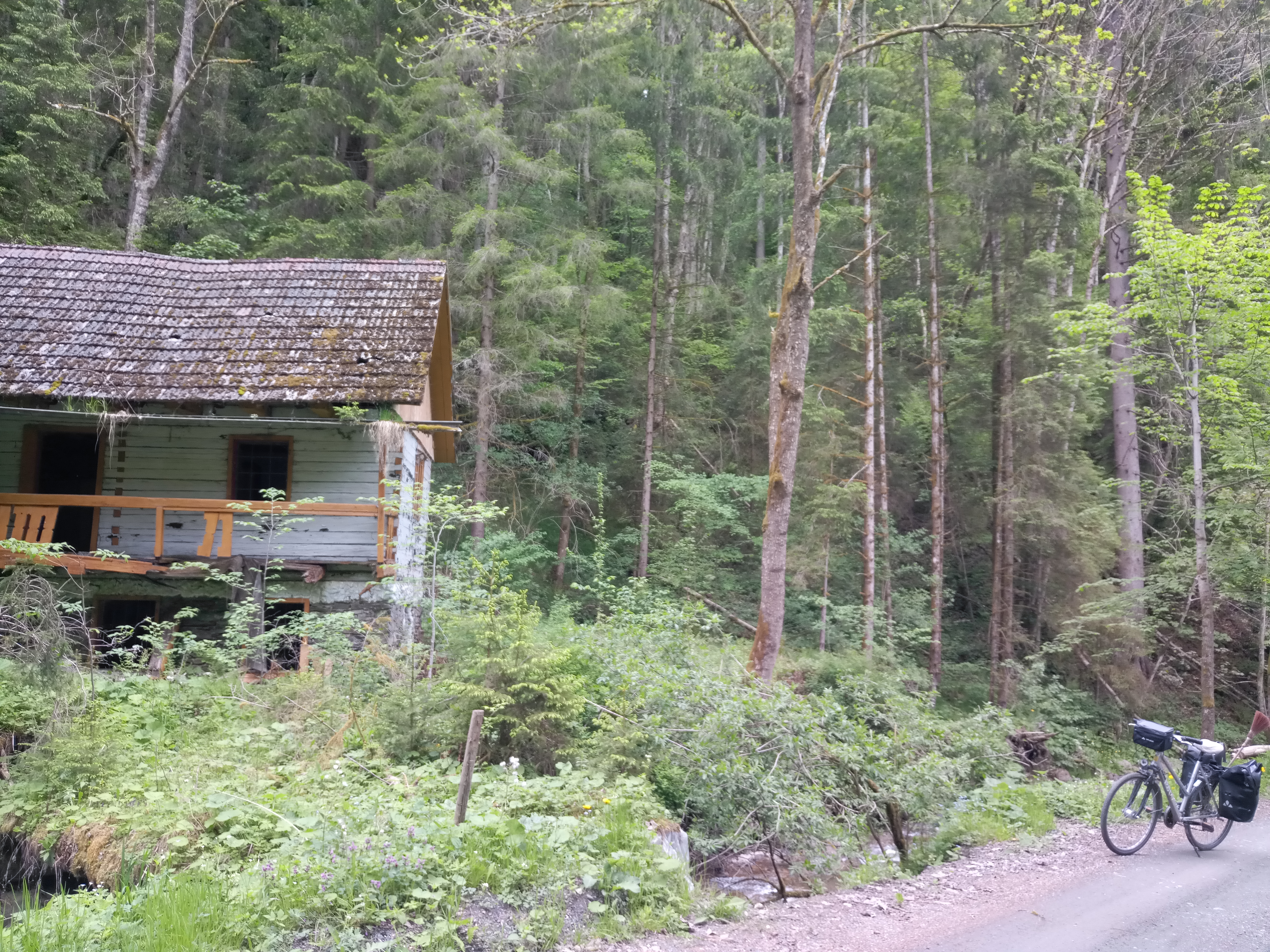 Gut genährt radelte ich dann weiter, wählte eine etwas ruhigere Nebenstrecke, in Griffen kaufte ich in einem Supermarkt noch etwas Proviant für die nächsten Tage ein, ehe es an den Aufstieg ging nach Pustritz. In der Karte sah das nach Straße aus, letztlich war es ein Schotterweg, der in einem abgelegenen Tal ohne Handyempfang stetig bergauf führte. Nur der Wald, steile Hänge, ein rauschender Bach und ich. Fast schon unheimlich, auf jeden Fall sehr abenteuerlich (hatte ich mir ja schließlich auch gewünscht…). Irgendwo stand auch ein zerfallenes Häuschen herum. Als ich echt schon dachte, ob ich hier je wieder rauskomme, gab es eine Abzweigung mit Straßennamen (nein, keine Angabe, wo der Weg hinführt… also die Beschilderung ist manchmal schon echt bescheiden… was nutzt mir z.B. eine Radwegnummer, aber keinerlei Angabe, wo der hinführt? Oder eine Beschilderung nur in eine Richtung, was mache ich, wenn ich aus der anderen komme und die nicht sehen kann?). Jedenfalls war es sehr steil, ich musste schieben und schwitzte den Berg hinauf. Irgendwann sah man auch auf die umliegenden Hügel, echt schön hier, es ging an sehr abgelegenen und zum Teil verlassenen Bauernhöfen vorbei, bunt blühenden Wiesen und Kuhweiden.