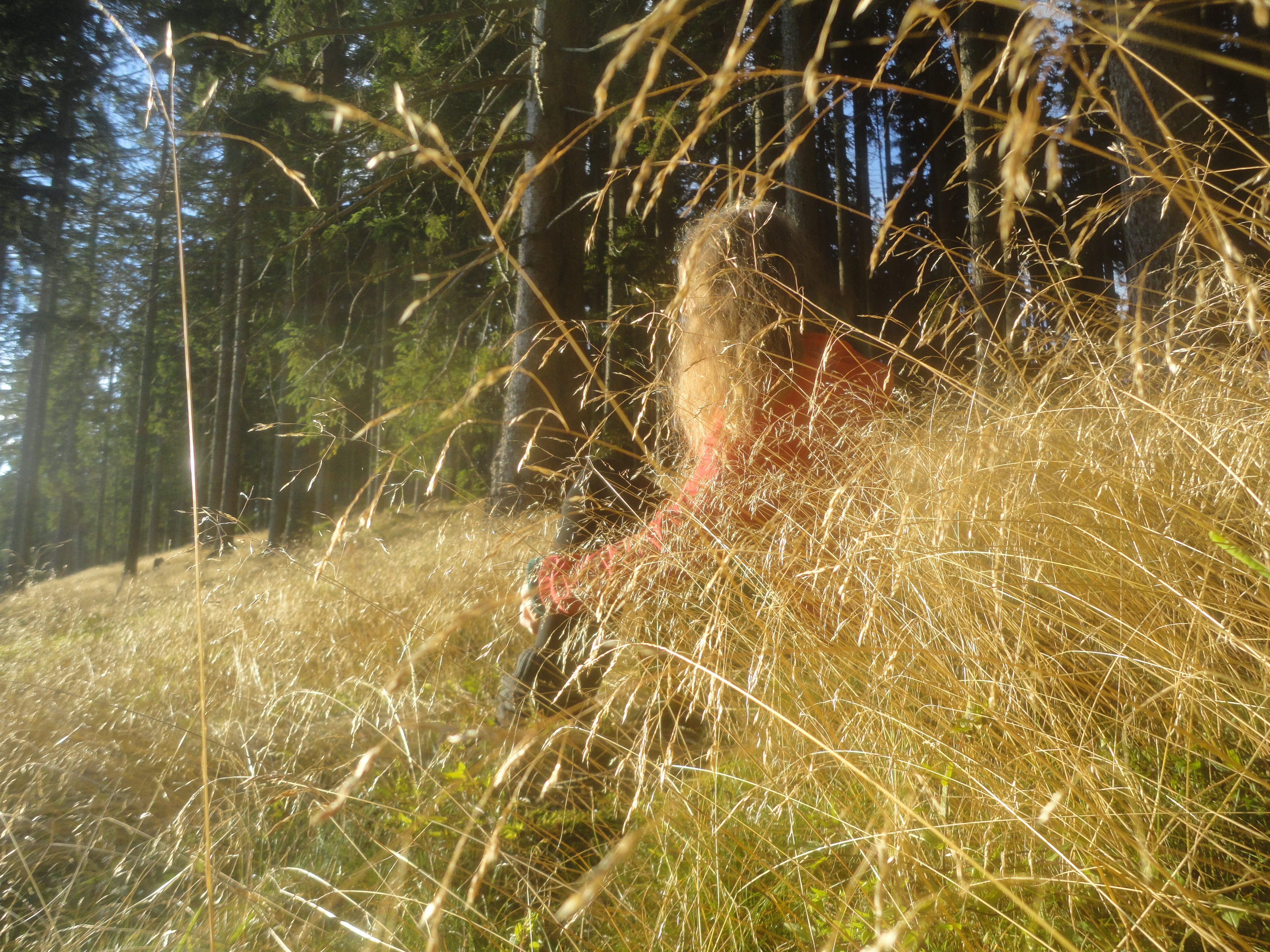 Am meisten berührt mich diesmal das herbstliche goldene Gras, es leuchtet so wunderschön in der Sonne und ich liebe es, darüber zu streicheln mit meinen Händen, mich hineinzukuscheln, es von allen Seiten zu betrachten, wenn es vom Wind gewiegt wird. Es hat so etwas Tröstliches, Lebendiges trotzdem Verblühtes, Vergängliches.