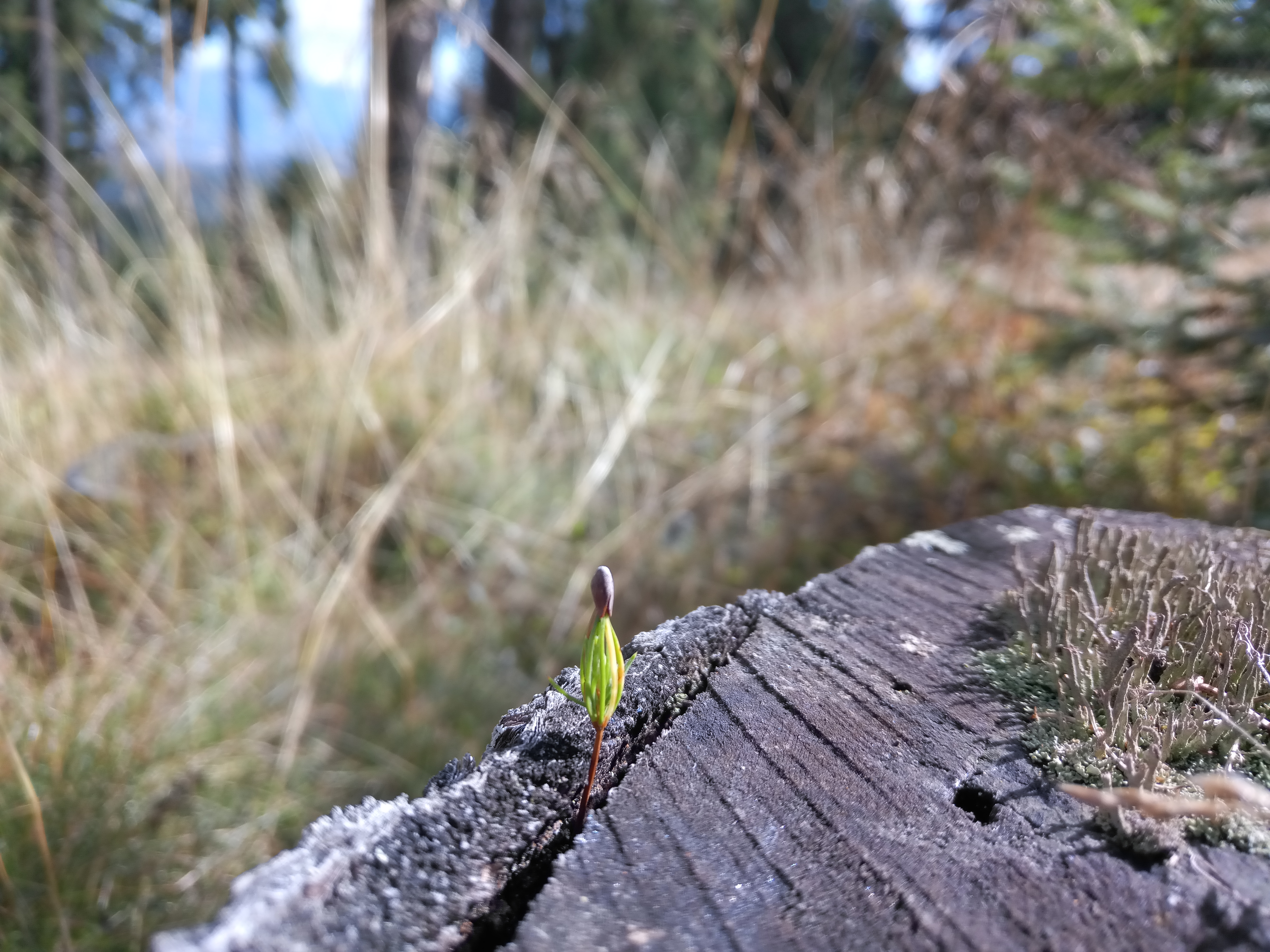 Nach einem weiteren Kaffee und dem Mittagessen in der Sonne am Balkon machte ich mich wieder auf in den Wald, zu meinem geliebten Herbstgras. Für Anfang Oktober war es auf über 1.000m Seehöhe schon sehr warm, andererseits war es natürlich fein, nackt im Moos und Gras sein zu können. Später lag ich auch nackt in der Hängematte, spürte die wärmende Sonne und wie der Wind über das Gras und meine Haut strich. Bis auf Eichhörnchen und diverse Vögel war niemand zu sehen oder zu hören, einfach wunderbar. Fernab von jeglichen Wanderwegen oder „Hotspots“ fühle ich mich am wohlsten, kann am leichtesten mit allen Sinnen wahrnehmen und mich ganz einlassen und verbinden mit mir und der Natur. Je länger ich an einem Platz verweile, desto mehr Tiere zeigen sich, meist sind es Meisen oder Rotkehlchen, die neugierig vorbeischauen und zwitschern, in den Ästen hüpfen. Auch all die wundervollen Kleinigkeiten liebe ich mir genau anzuschauen, wie Flechten und Moose und kleine Pilze und keimende Samen das Leben erneuern.