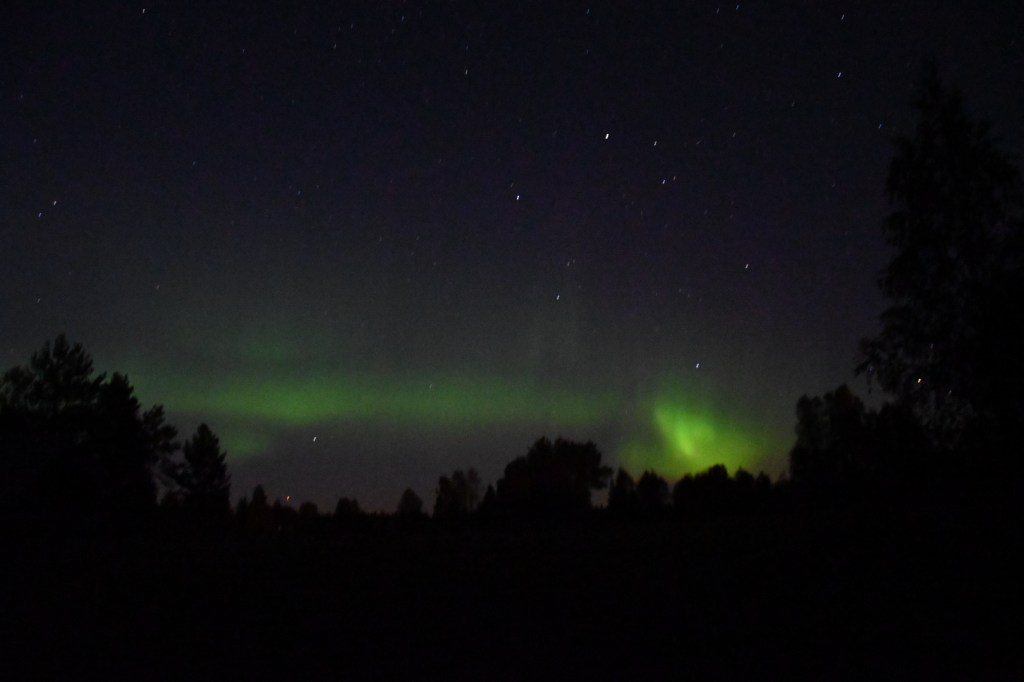 Und dann ging ein Traum von mir Erfüllung – Polarlichter!!! Wir saßen im Windschutz am Feuer und schauten immer wieder hinaus, ich bewunderte den wunderschönen Sternenhimmel und auf einmal tauchte am nördlichen Horizont ein grünes Band aus Licht auf. Schwer zu beschreiben, was ich fühlte – pures Glück, Freude, Tränen der Rührung, ein Zauber, eine knisternde Stille. Beim Schreiben bekomme ich Gänsehaut. Das Band bewegte sich ganz sanft am Himmel entlang, in Wellen strömte es über den dunklen Baumwipfeln, streichelte die Sterne, küsste mein Herz. Und irgendwann verschwand es so leise wie es gekommen war. Und ich blieb da auf der Wiese, staunend, zutiefst berührt, von der Kälte der Nacht überrascht.