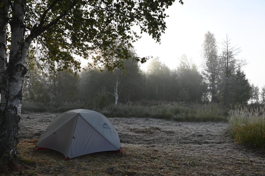 War es weiter im Süden mit den beiden Schlafsäcken noch kuschelig warm gewesen, so waren es in dieser Nacht Minusgrade und ich fror einfach nur, zum Glück war die Hütte in der Nähe, so dass ich mich dort aufwärmen konnte. Die nachfolgenden Nächte konnte ich auch nur schlafen, in dem ich nun drei Unterlegsmatten, drei Schlafsäcke und eine Wärmflasche hatte, die mal die Füße, mal den Hintern oder den Rücken wärmte. Und Zähne putzen und umziehen am Feuer, damit ich dann gleich in den Schlafsack schlüpfen konnte. Es war ja schon Herbst, das Laub der Heidelbeeren tiefrot, das der Birken golden in der Sonne. Und ich hatte so ein Glück mit dem Wetter!!! Untertags war es so warm, dass ich durchaus auch nackt unterwegs sein konnte, des nachts dafür um den Gefrierpunkt. Als ich abreiste, regnete es über eine Woche durch!