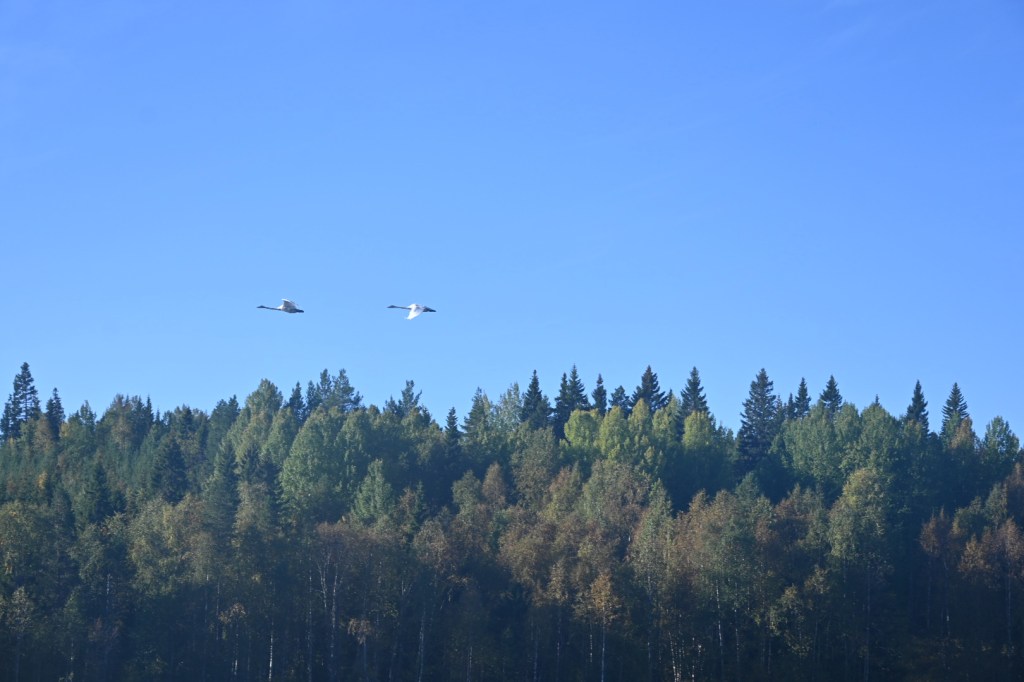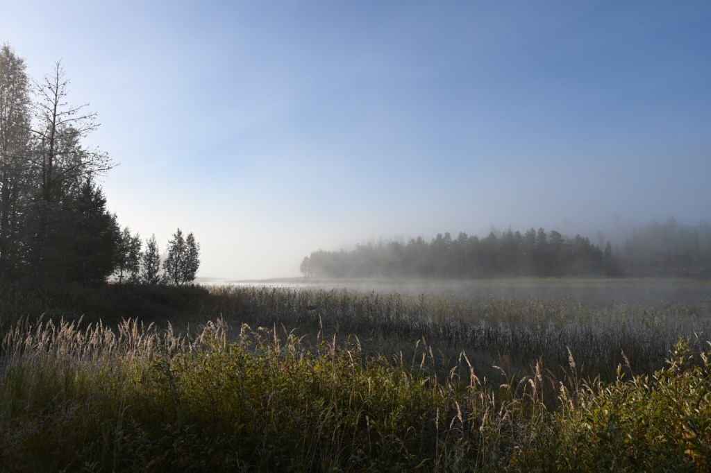 Der nächste Morgen war magisch – alles von Raureif überzogen, über dem See waberte der Nebel und ich sah ihm beim Verschwinden zu, während ich im Windschutz meinen Morgenkaffee trank. Langsam erhob sich die Sonne über den Wald und tauchte alles in ein Zauberlicht. Und Singschwäne flogen vorbei, die mich sehr berührten mit ihren Rufen. Vor vielen Jahren hatte ich mal in Island welche gesehen, umso mehr freute ich mich, dass hier ganz in der Nähe mehrere lebten und mich mit ihrem Gesang erfreuten. Auf einer nachmittäglichen Kanufahrt sahen wir sie wieder, während herbstfarbenes Gras an uns vorbeizog und es schon Zeit für Handschuhe war. Die Zeit verging hier anders, fließender, ruhiger, einfach sein, eintauchen. Abends am Feuer sitzen und die Mondin anschauen, Lieder singen und es geruhsam angehen lassen.