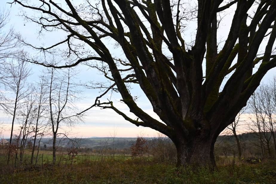 Nach einer Weile machte ich mich wieder an den Aufstieg und oben am Hügel bewunderte ich noch eine riesige Eiche, die so um die 400-500 Jahre alt ist, leider eingezäunt, so dass ich sie nicht berühren konnte. Mittlerweile dämmerte es schon an diesen kurzen Tagen, auf der Rückfahrt genoss ich noch das ganz andere Aussehen der Häuser in dieser Gegend. Und es tat einfach gut, mal woanders zu sein, immer wieder die ausgetretenen Pfade zu verlassen, es gibt so viel Neues und Schönes zu sehen. Im Dunkeln führte mich das Navi am Handy gut nach Hause durch viele unbekannte Orte und es war dann auch wieder schön, als ich die Ortsnamen wieder kannte und mich orientieren konnte. Der Tag klang noch länger in mir nach und hatte sehr gutgetan und mir Kraft gegeben. Danke!