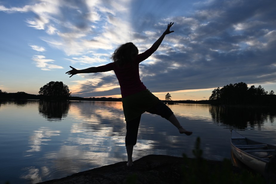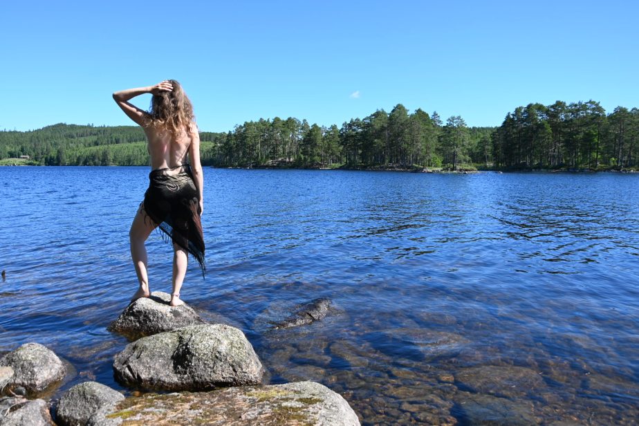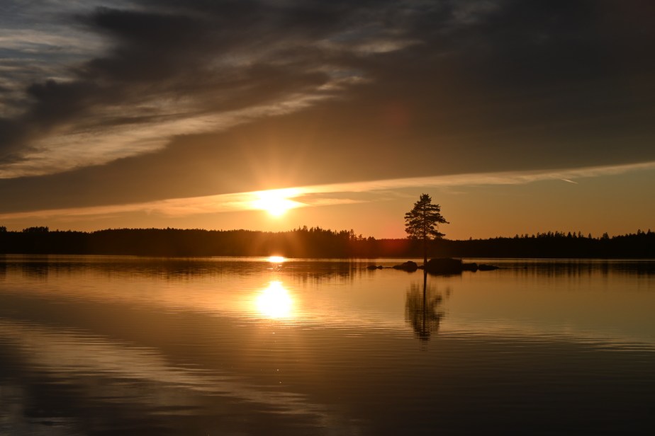 Abends wurde der See und auch ich wieder ruhig. Fuhr zu meiner Mondinsel, tanzte nackt im sanften Sonnenuntergang, genoss es, der Himmel so weit. Spiegelte mich im See. Ließ mich treiben auf dem Wasser, bewunderte Wolkenformationen und wie sich das Licht langsam änderte. Saß noch lange am Feuer in diesem Farbenspektakel, das der Himmel an meinem letzten Abend für mich gezaubert hatte. Mein letzter Morgen war fein, mit erfrischendem Morgenbad, leckerem Frühstück, einem wunderbar ruhigen See. Packte in Ruhe alles ein, machte den Platz sauber und bedankte mich für diese nährende Zeit auf der Insel. Hatte noch ausreichend Zeit, bis ich abgeholt wurde, so konnte ich noch gemütlich paddeln, am Windschutz vorbeischauen und bei Seerosen, in der Sonne schlummern und Kranichen lauschen. Obwohl am Camp von Outdoor Schweden wenig los war, kam es mir doch voll vor nach den Tagen der Einsamkeit, aber ein wenig reden tat auch wieder gut und abends durfte ich sogar mal angeln probieren. Am nächsten Tag fuhr ich dann weiter nach Norden, aber das ist eine andere Geschichte…